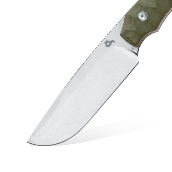 The blade made of D2 tool steel with stonewash finish has a drop point profile and a high flat grind. Long jimping will help with heavier work. The spine has a swedge, significantly improving penetrating properties.