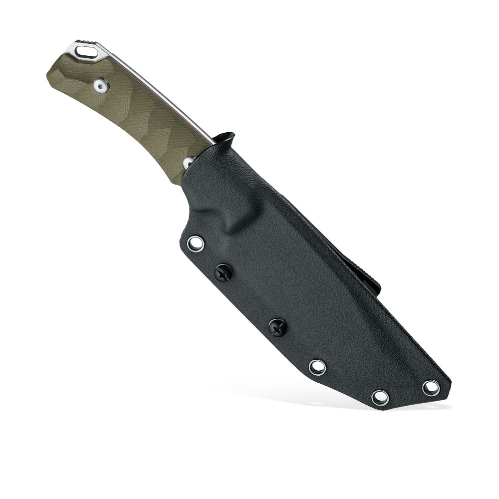 Knife comes with sheath made of Kydex. Kydex is characterized by high impact and scratch resistance, low moisture absorption, resistance to various weather conditions and many chemicals. Sheaths made of it are used comfortably and for a long time. To facilitate the removal of the knife, a thumb rest has been designed, thanks to which the knife can be removed in a controlled and safe manner. The sheath has pass-through pins to which you can attach, for example, a tinder holder (not included) or use them to attach it to a backpack.
