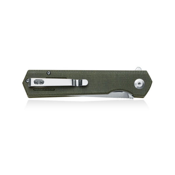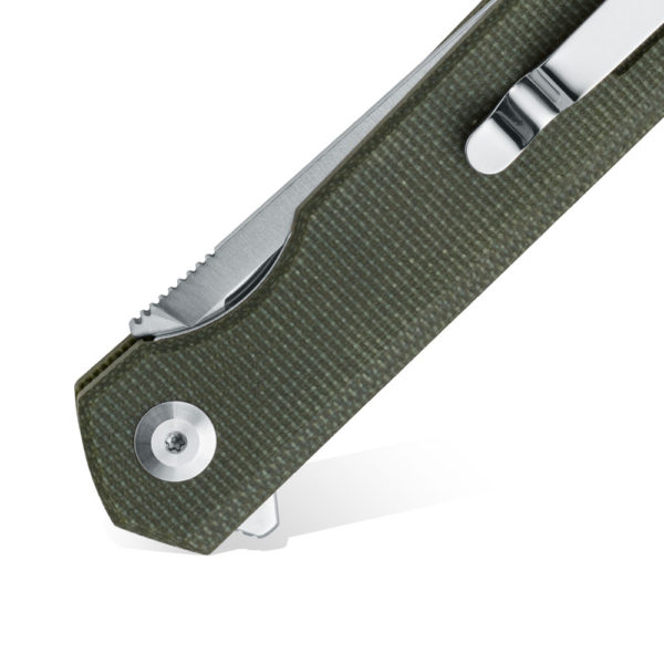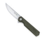 Black FOX Revolver BF-740 OD Folding Knife Green Micarta it has a D2 steel blade (satin finish). Grips are made of OD Green Canvas Micarta. The knife is opened with a flipper and the blade is blocked by the liner lock. The knife is equipped with a steel carrying clip.