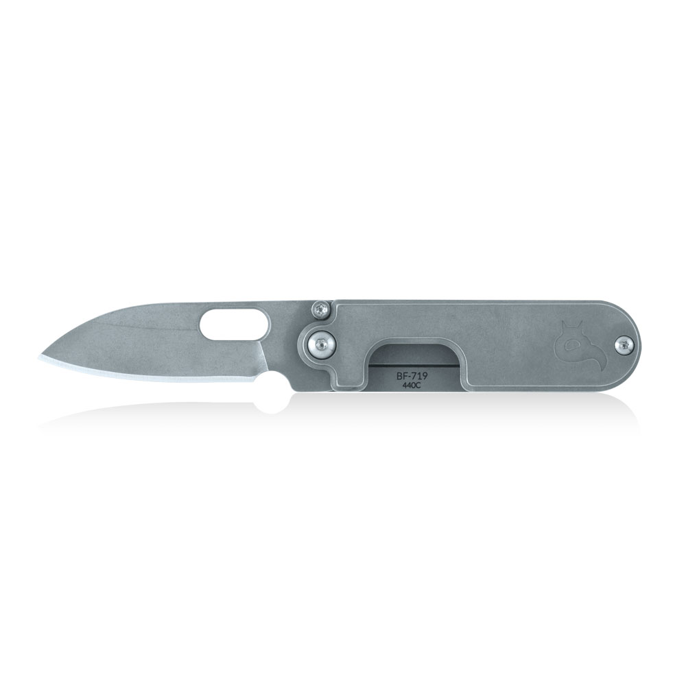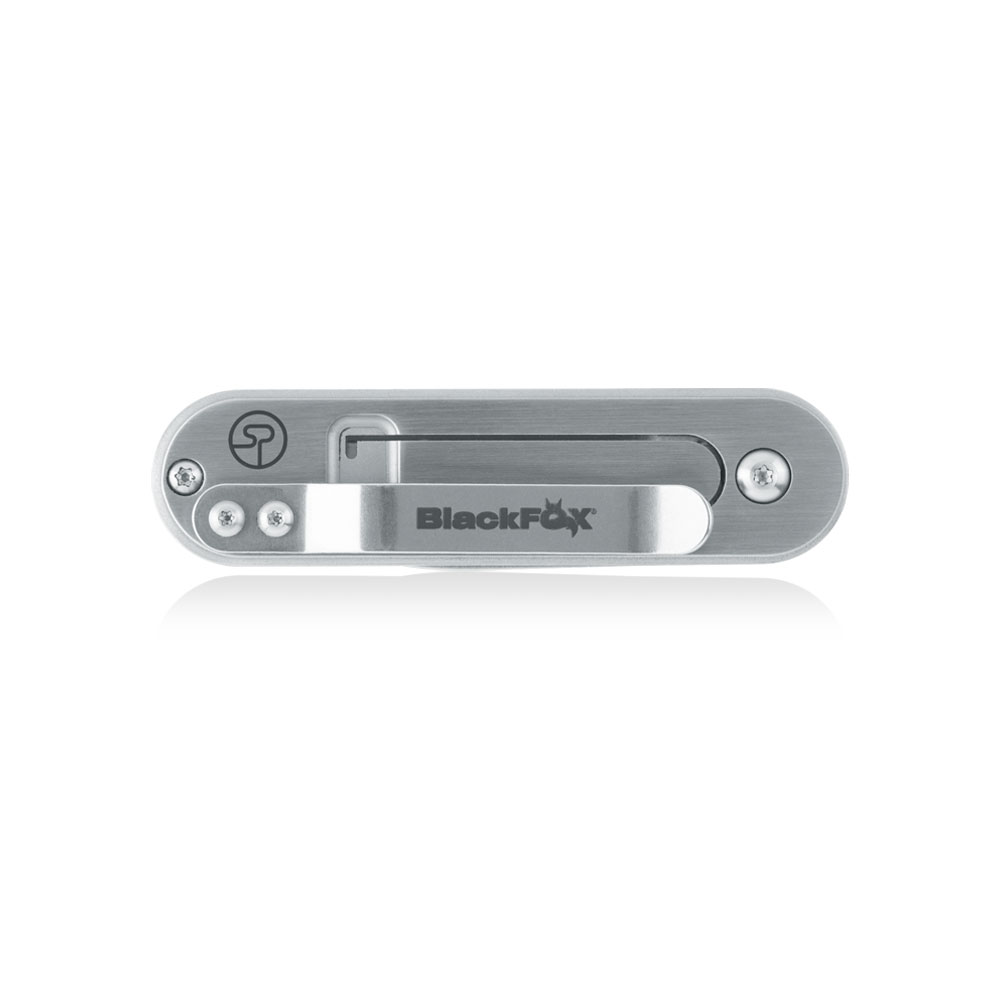 Black FOX Bean Gen2 BF-719 by Serge Panchenko has a 440C stainless steel sheepsfoot blade and a stainless steel handle (both stone washed). We open the knife blade with one hand using the hole in the blade or with both hands. The knife is equipped with a steel carrying clip.