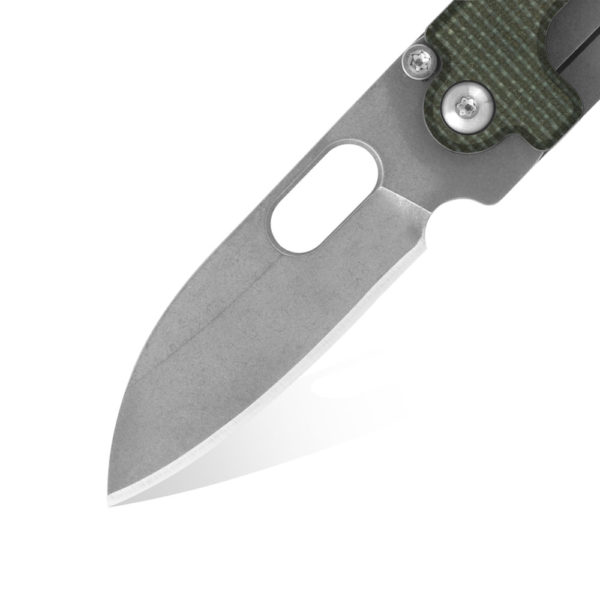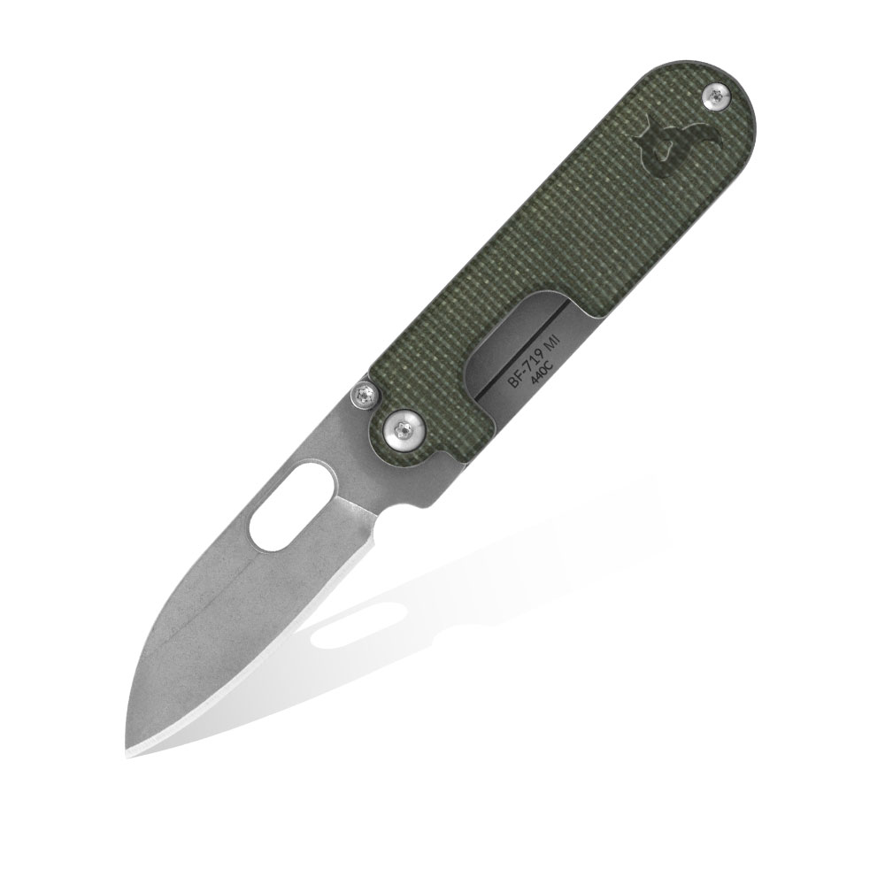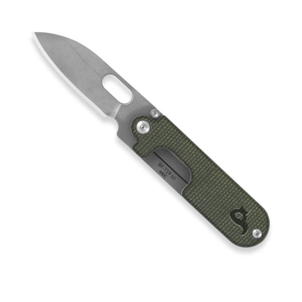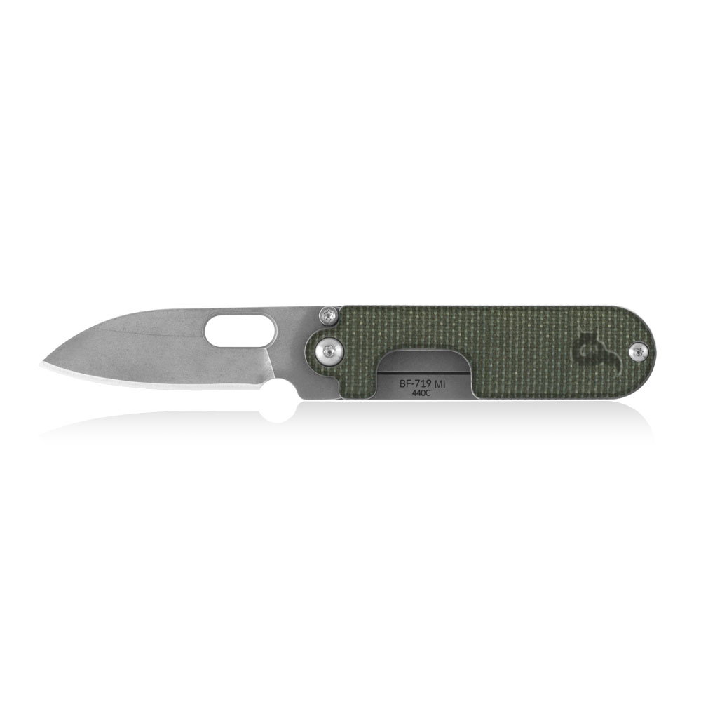 Black FOX Bean Gen2 BF-719 MI Green Micarta by Serge Panchenko has a 440C stainless steel sheepsfoot blade (with satin finish) and a steel and green micarta handle. We open the knife blade with one hand using the hole in the blade or with both hands. The knife is equipped with a steel carrying clip.