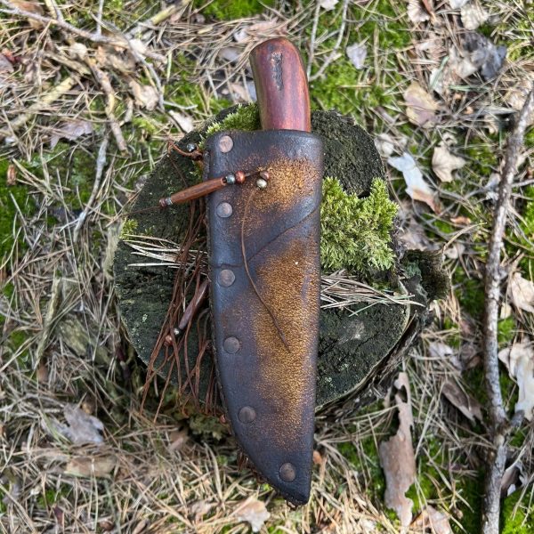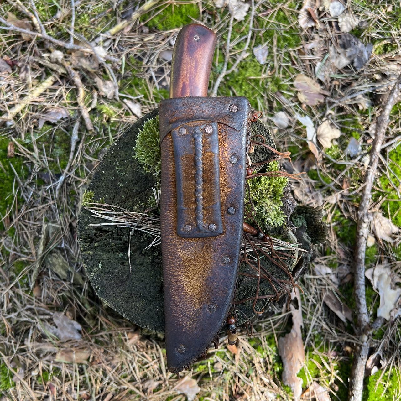 Frontier knives are made of steel that can be easily sharpened in the field (NCV1), which goes back to the past of cutlery and the art of using knives. The blades have a variety of fancy finishes and patterns. Each of them is unique and one of a kind. In the knifemaker’s dictionary, this type of finish is referred to as “chaotic satin coated with random oxidation”. These treatments and amphibian roughness are performed in an original way by a knifemaker. The handles are mainly made of deer antlers dyed by the creator and have a leather wrapping prepared by a knifemeker in a way that guarantees resistance to weather conditions. Sheaths made of natural vegetable tanned leather (cowhide and deer chamois) have a variety of colors and accessories individually selected for each project by the creator. The Frontier is a knife that appears to have many irregularities at first glance, but is in fact planned in every unevenness and roughness from start to finish by the creator.