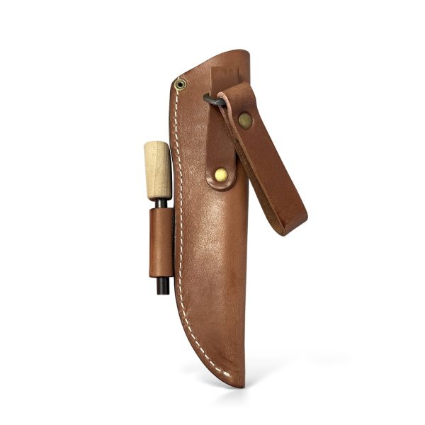 Knife comes with a leather sheath. This is a classic solution that matches the style of the tools in it. Wood and leather have always been the perfect combination. Bright stitching gives it a very original look. The knife sheath has a high profile and hides part of the handle to better protect the knife from falling out. It is traditionally attached to the waist or a backpack in an upright position. The sheath has a slot for a ferro rod (included).