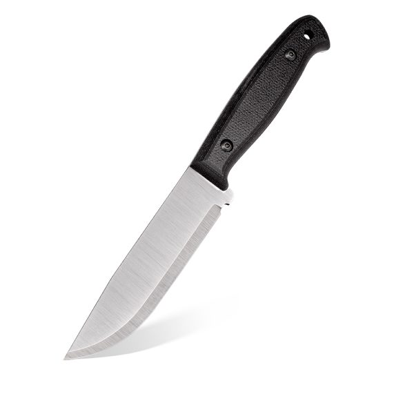 - Blade: Fixed blade (full tang), drop point style blade with scandi grind and cutting edge, plain cutting edge