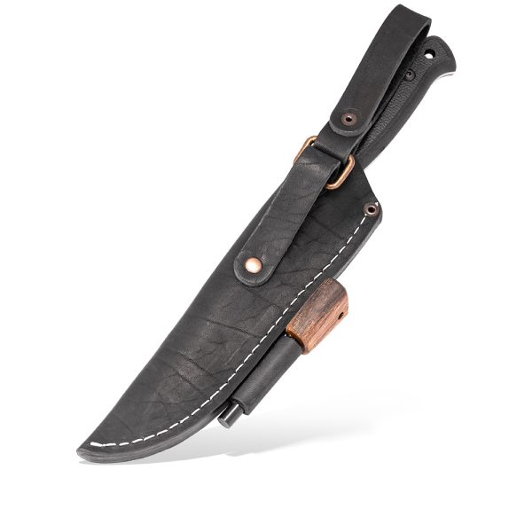 **SHEATH**: The knife comes with a hand-formed, solid sheath made of genuine leather. The leather sheath and the knife with a wooden handle are a classic and beautiful combination. The sheath is stitched with nylon thread, which adds solidity and gives it an original look. The knife sheath has a high profile and hides part of the handle to better protect the knife from falling out. It is traditionally attached to the belt:
