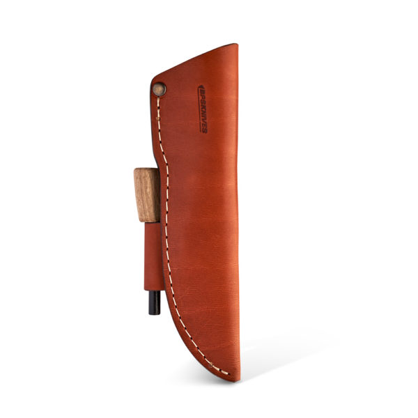 Knife comes with a leather sheath. This is a classic solution that matches the style of the tools in it. Wood and leather have always been the perfect combination. Bright stitching gives it a very original look. The knife sheath has a high profile and hides part of the handle to better protect the knife from falling out. It is traditionally attached to the waist or a backpack in an upright position. The sheath has a slot for a ferro rod (included).