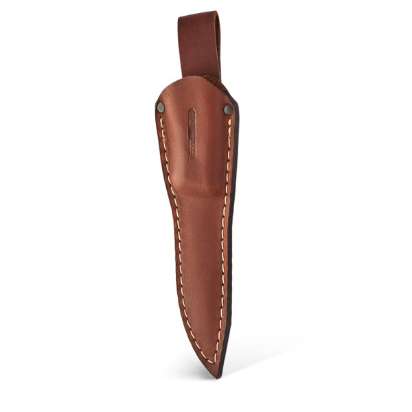 Knife comes with a leather sheath. This is a classic solution that matches the style of the tools in it. Wood and leather have always been the perfect combination. Bright stitching gives it a very original look. The knife sheath has a high profile and hides part of the handle to better protect the knife from falling out. It is traditionally attached to the waist or a backpack in an upright position.