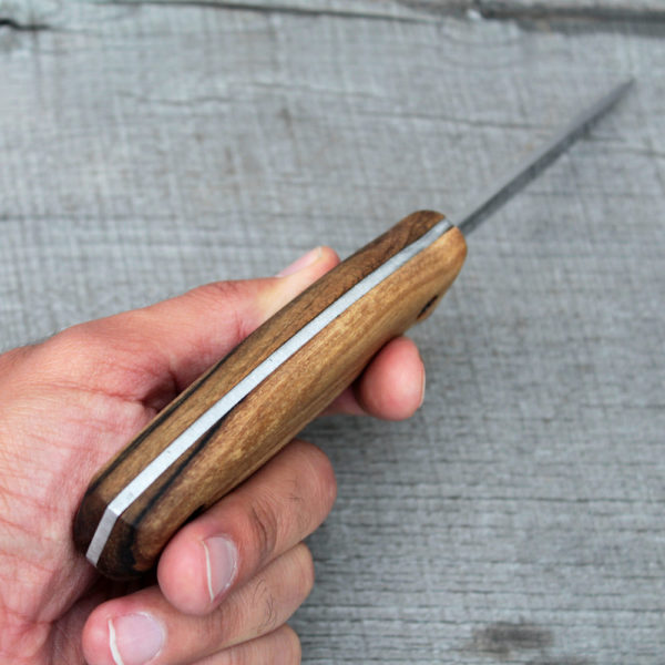 The blade made of 1066 carbon steel with polished finish has a drop point profile and a scandinavian grind. Since the blade of this camping knife is made of carbon steel, it should be washed well and wiped dry after use, this will protect your knife from corrosion.