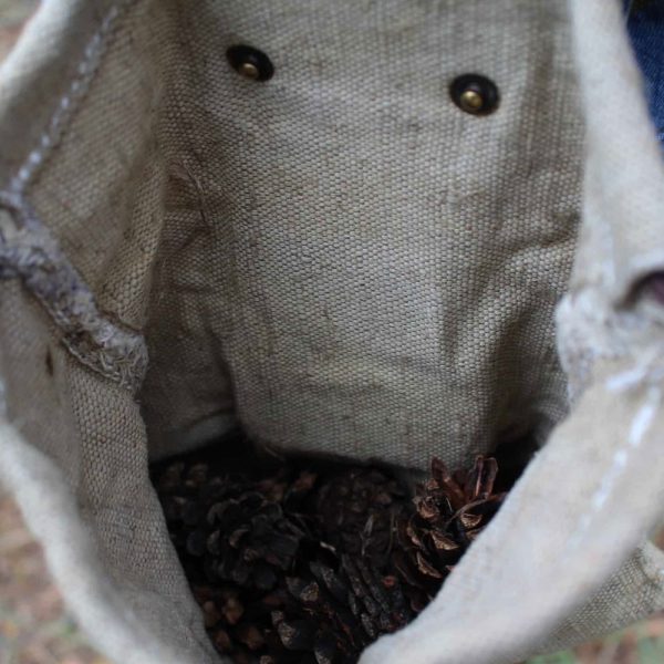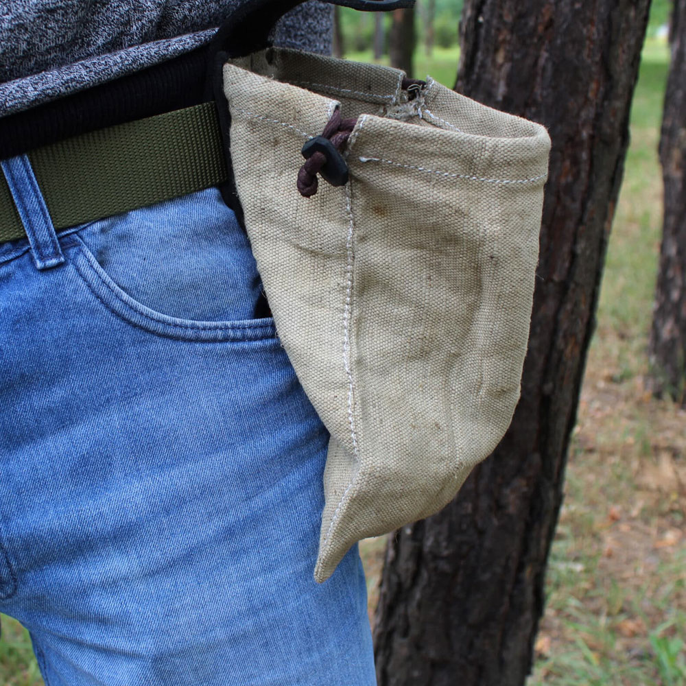 Fastened to the waist in a folded position, it takes up little space and is a comfortable aesthetic addition to clothing. However, when there is a need for additional cargo space with easy access while the need for free hands, it is an irreplaceable companion of bushcraft-survival trips and mushroom picking. The bag is made of breathable canvas and leather.