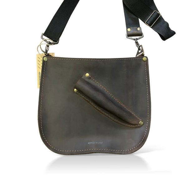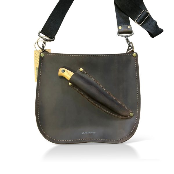 It is made of strong leather and its nylon belt fastened with buckles allows you to wear it on your shoulder or over your shoulder. The bag does not have a clasp to facilitate quick access to its chamber when collecting mushrooms or cones for kindling. On the outside, it also has a sheath for a knife sewn in such a way that the tool is always at hand when it is needed.