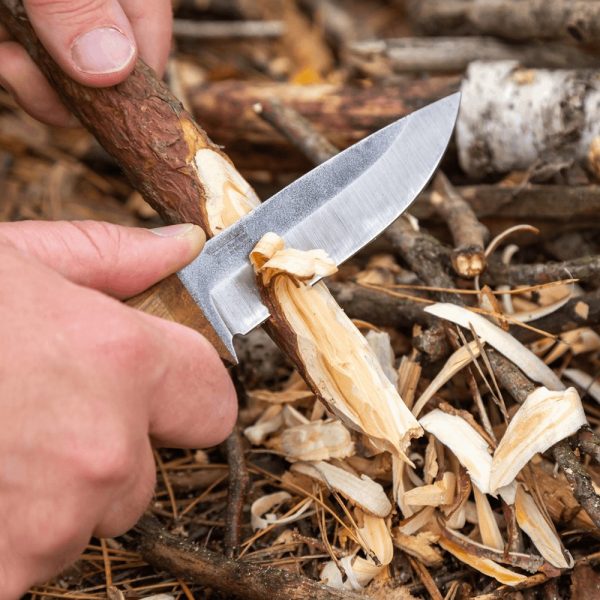 The blade made of 1066 carbon steel with polished finish has a drop point profile and a scandi grind. Since the blade of this camping knife is made of carbon steel, it should be washed well and wiped dry after use, this will protect your knife from corrosion.