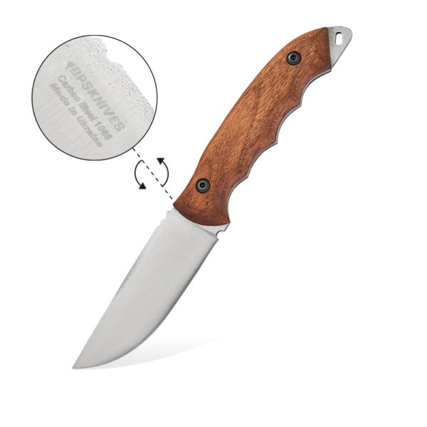 BPS Knives HK4 Camping Knife Carbon Steel has a full tang construction, made of one section of steel running through the entire length and width of the handle, to which the scales of walnut wood are attached.