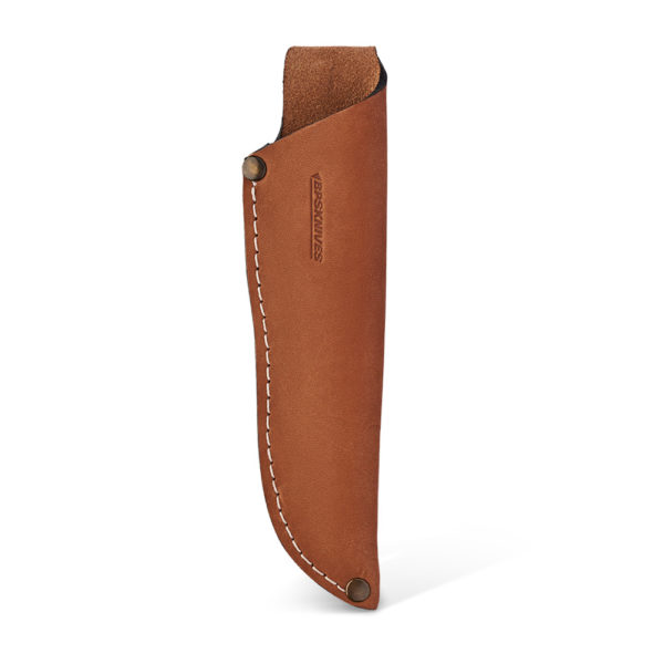 Knife comes with a leather sheath. This is a classic solution that matches the style of the tools in it. Wood and leather have always been the perfect combination. Bright stitching gives it a very original look. The knife sheath has a high profile and hides part of the handle to better protect the knife from falling out. It is traditionally attached to the waist or a backpack in an upright position.