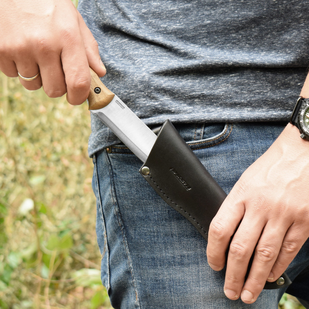 Knife comes with a leather sheath. This is a classic solution that matches the style of the tools in it. Wood and leather have always been the perfect combination. Stitching gives it a premium look. The knife sheath has a high profile and hides part of the handle to better protect the knife from falling out. It is traditionally attached to the waist or a backpack in an upright position.