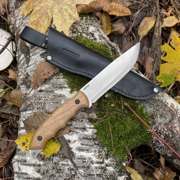 BPS Knives HK5 Bushcraft Knife has a full tang construction, made of one section of steel running through the entire length and width of the handle, to which the scales of walnut wood are attached.