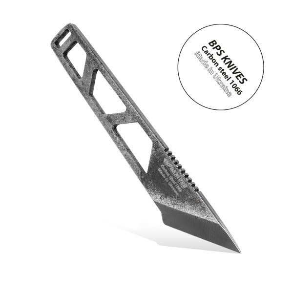 BPS Knives Mini Kiridashi Knife has a working blade profile resembling a scalpel made of 1066 carbon steel and a scandinavian grind. The handle without scales, has holes for personalizing the knife with paracord or strap braids. Complete with a knife is a black plastic sheath and a lanyard.