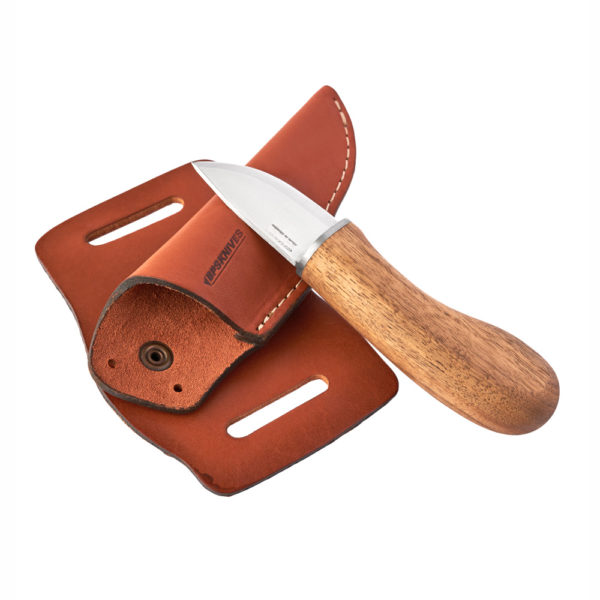Knife comes with a leather sheath. This is a classic solution that matches the style of the tools in it. Wood and leather have always been the perfect combination. Bright stitching gives it a very original look. The knife sheath has a high profile and hides part of the handle to better protect the knife from falling out. It is attached to the waist with two parts. One is strapped to a belt and the other is pinned to the first one. This solution allows you to detach the knife together with the sheath.