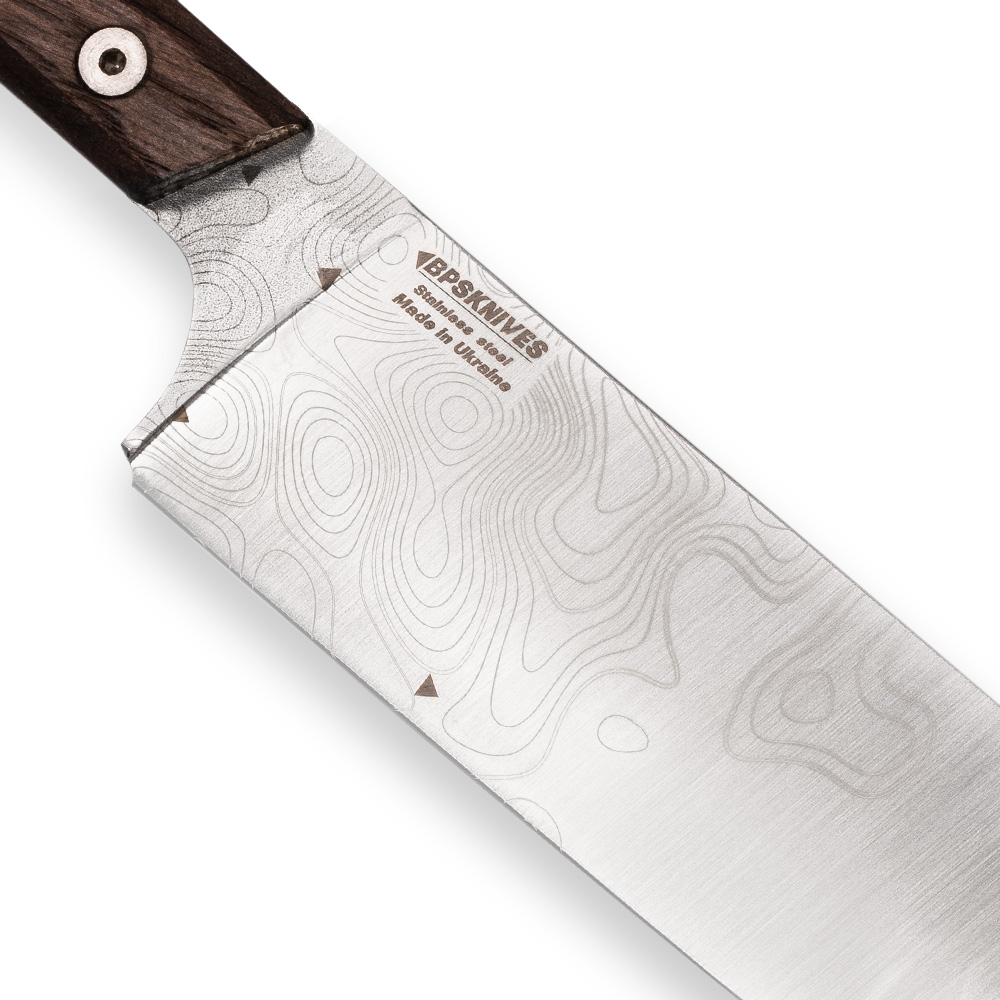 BPS Knives Rosemary Umber – Limited Edition Handmade Kitchen Knife | Satin Stainless Steel 5Cr14MoV Bog Oak Black Leather. Limited edition of the knife available only in Polish distribution. Knife designed for both professional and casual users. Handcrafted in the workshop of a Ukrainian manufactory.