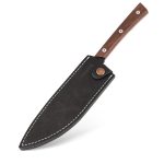 **ELEGANT LEATHER SHEATH**: The knife comes with a leather sheath secured with a snap closure. This classic leather sheath complements the knife’s overall aesthetic, with walnut wood and leather forming a timeless combination. Bright stitching adds a unique touch to the sheath. It provides excellent protection for the knife, making it practical for travel and outdoor kitchen use.