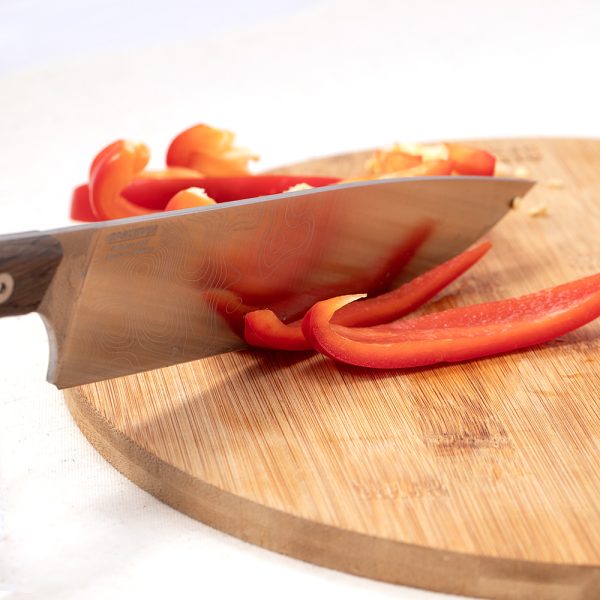 **STAINLESS STEEL BUILT FOR KITCHEN PERFORMANCE**: The blade is crafted from 5Cr14MoV stainless steel with a satin finish on the flats and adorned with a decorative laser-etched pattern. This stainless steel performs exceptionally well in humid environments, offering good elasticity and easy sharpening.