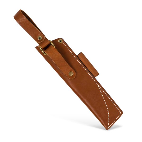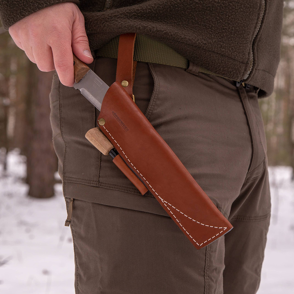 This sheath made of genuine leather, glued and stitched with strong nylon thread. Leather thickness – 3 mm. An additional insert under the wedge allows you not to cut through them with the sharpened part of the blade. The sheath fits perfectly for BK06 type knives. The sheath is equipped with Ferro Rod.
