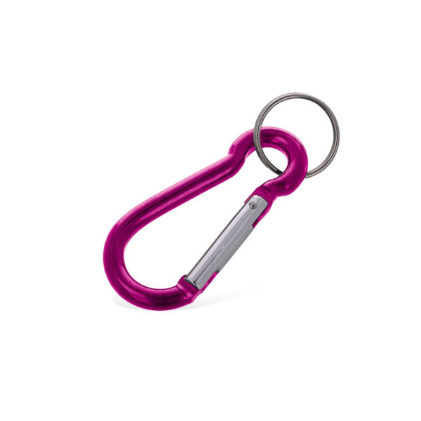 Carabiner FOX 6 Aluminium IO-30706 Pink 6 cm made of light and durable pink anodized aluminum (it is resistant to moisture – stainless). The spring-loaded movable element of the carabiner has a silver color, which intuitively indicates the place that should be pressed to open the carabiner. An inseparable element of the carabiner is a steel ring used to attach keys, etc. to the permanent element of the backpack.