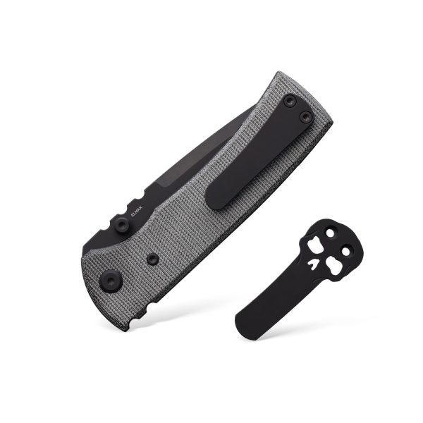 - Handle: Steel frame (PVD finish), G10 backspacer, black Micarta (Black Canvas Micarta) scales, steel torx screws, steel clip (PVD finish)
