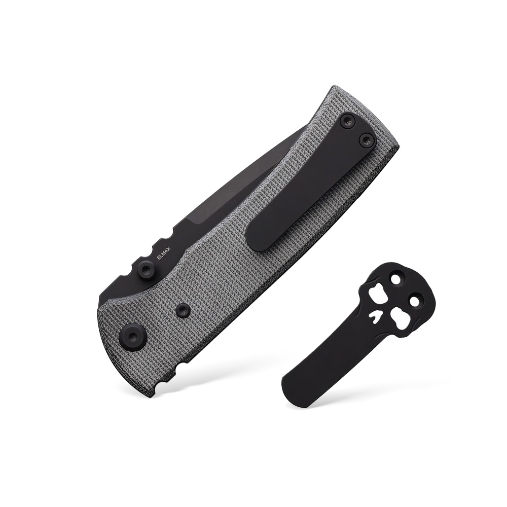 - Steel: Elmax (60-62 HRC), black PVD finish