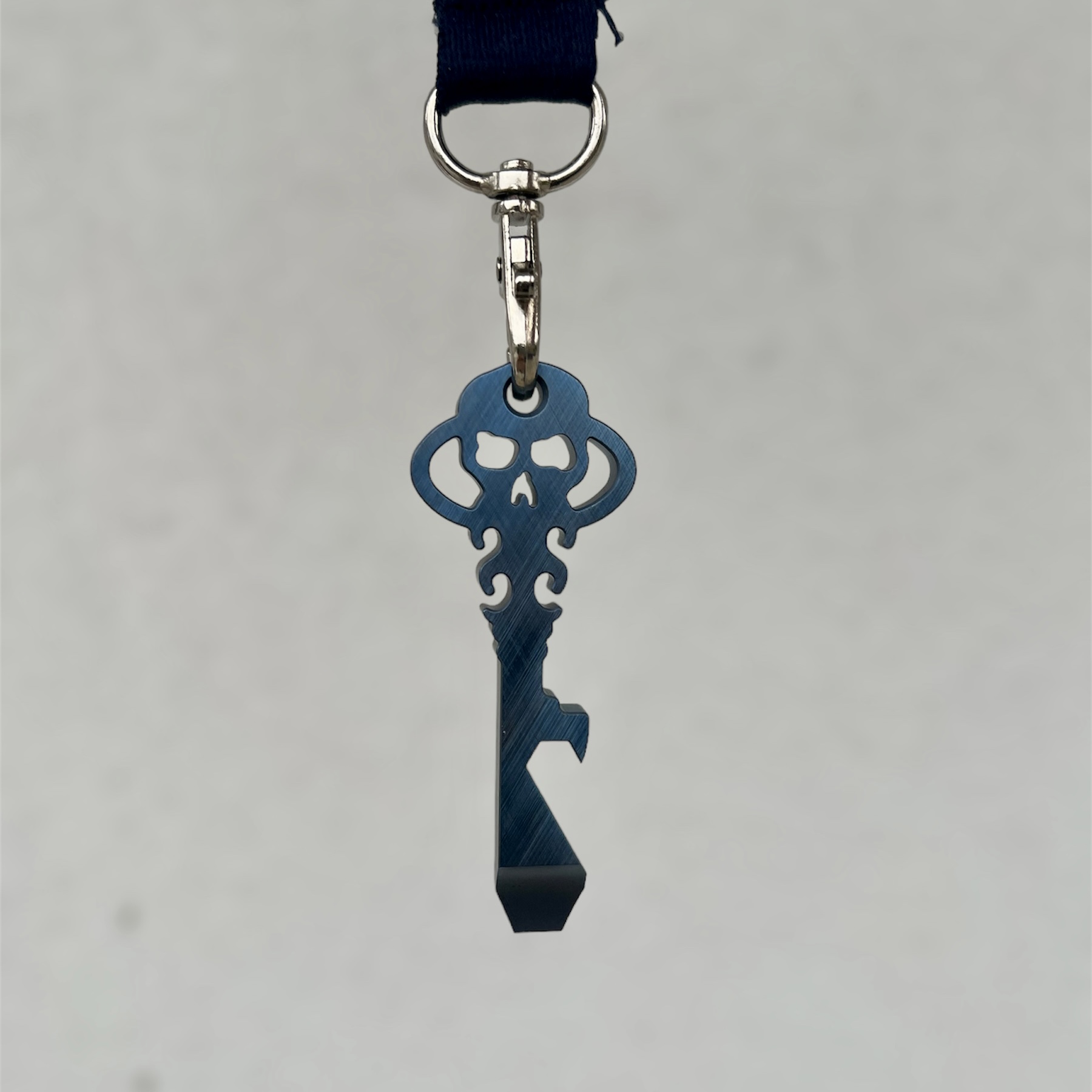 Chaves Knives Skeleton Key Pry Bar Multitool CrossHatch BLUE is a compact tool made of blue-anodized titanium, with a crosshatch finish, having many uses. It can be a keychain or a tasteful neck pendant. It has many applications and its basic functions are a pry bar, bottle opener, 1/4″ hex wrench and a flat head screwdriver. The skull motif, manufacturer-specific, is inscribed in the shape of a key.
