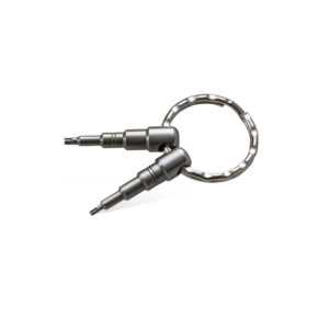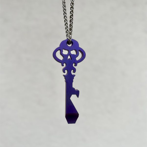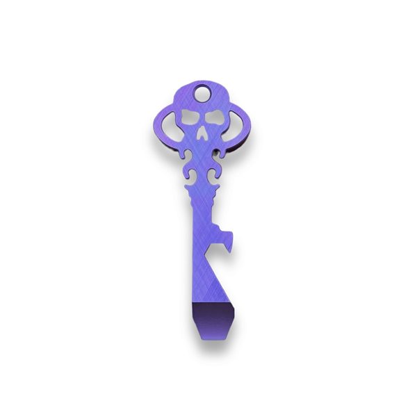 Chaves Knives Skeleton Key Pry Bar Multitool CrossHatch High Voltage PURPLE is a compact tool made of purple-anodized titanium, with a crosshatch finish, having many uses. It can be a keychain or a tasteful neck pendant. It has many applications and its basic functions are a pry bar, bottle opener, 1/4″ hex wrench and a flat head screwdriver. The skull motif, manufacturer-specific, is inscribed in the shape of a key.