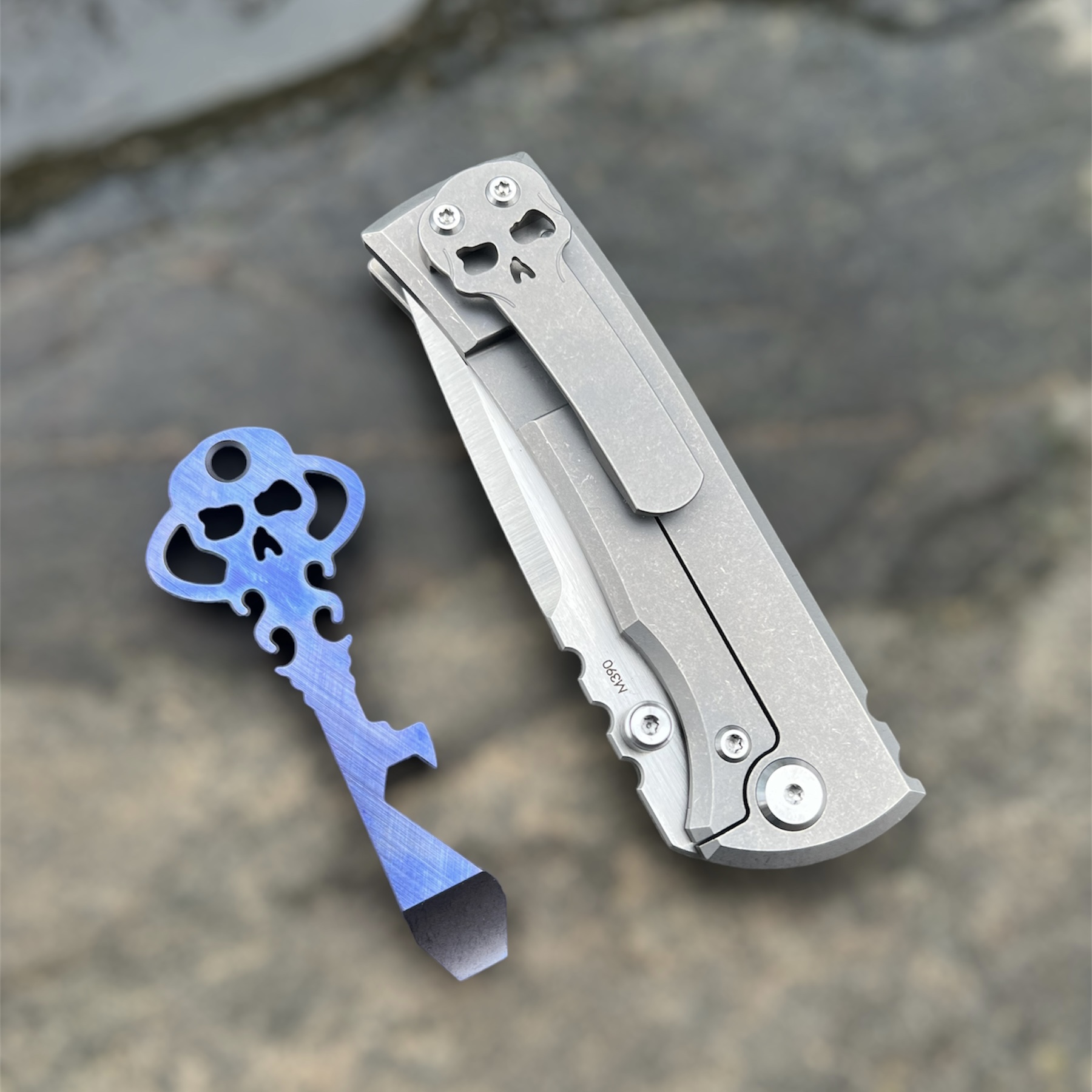 Chaves Knives Skeleton Key Pry Bar Multitool CrossHatch PURPLE is a compact tool made of purple-anodized titanium, with a crosshatch finish, having many uses. It can be a keychain or a tasteful neck pendant. It has many applications and its basic functions are a pry bar, bottle opener, 1/4″ hex wrench and a flat head screwdriver. The skull motif, manufacturer-specific, is inscribed in the shape of a key.