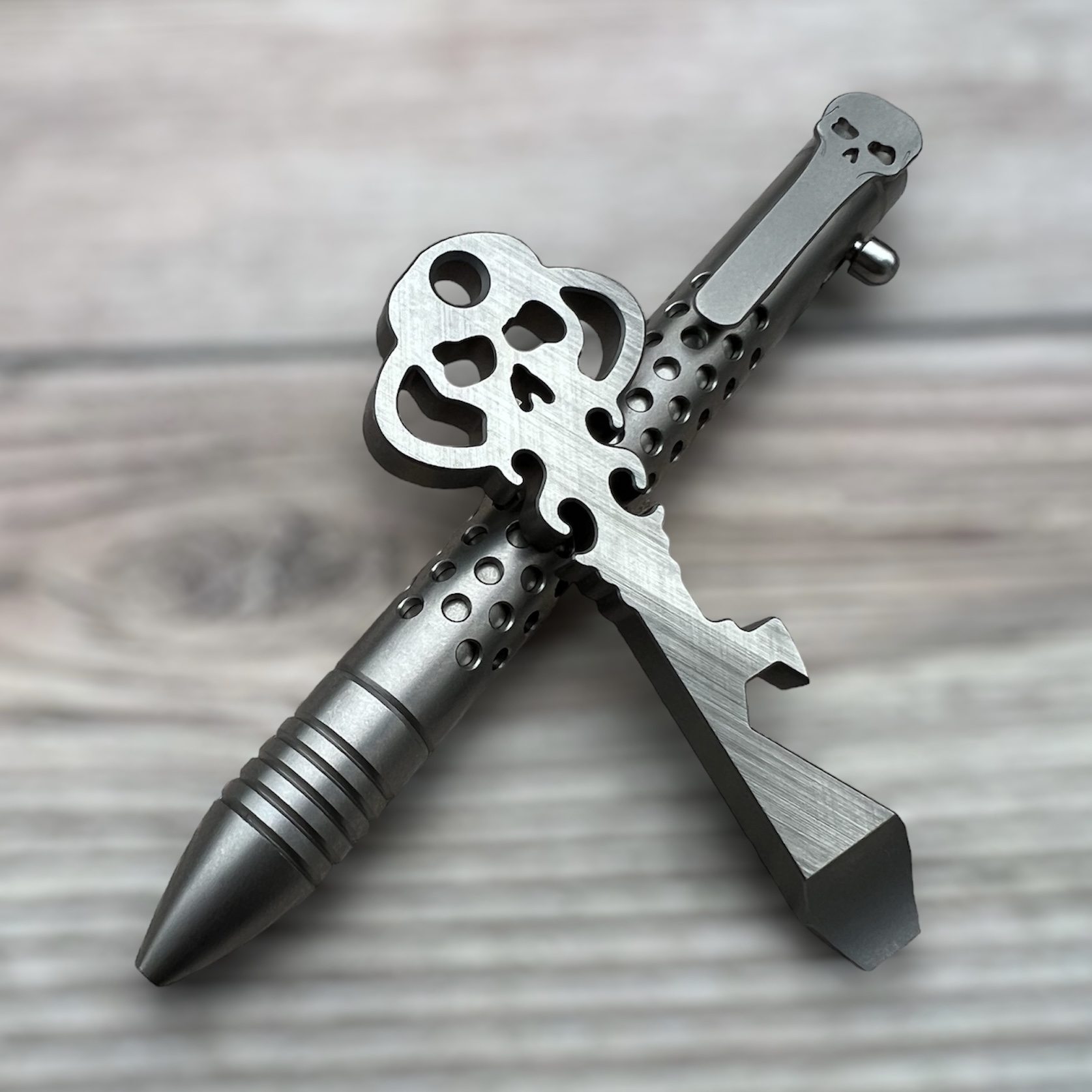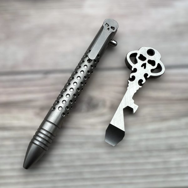 Chaves Knives Skeleton Key Pry Bar Multitool CrossHatch SILVER is a compact tool made of silver-anodized titanium, with a crosshatch finish, having many uses. It can be a keychain or a tasteful neck pendant. It has many applications and its basic functions are a pry bar, bottle opener, 1/4″ hex wrench and a flat head screwdriver. The skull motif, manufacturer-specific, is inscribed in the shape of a key.