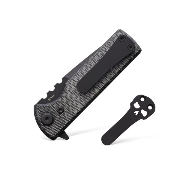 Presented knife features a drop point blade made of high-quality Elmax steel, opened with flipper. It has a steel construction and black Micarta (Black Canvas Micarta) handle scales. Whole steel elements including Elmax blade are black PVD coated. The liner lock ensures safe use, while two included pocket clips—one classic and one skull-shaped, a signature of Chaves Knives—provide secure carry.