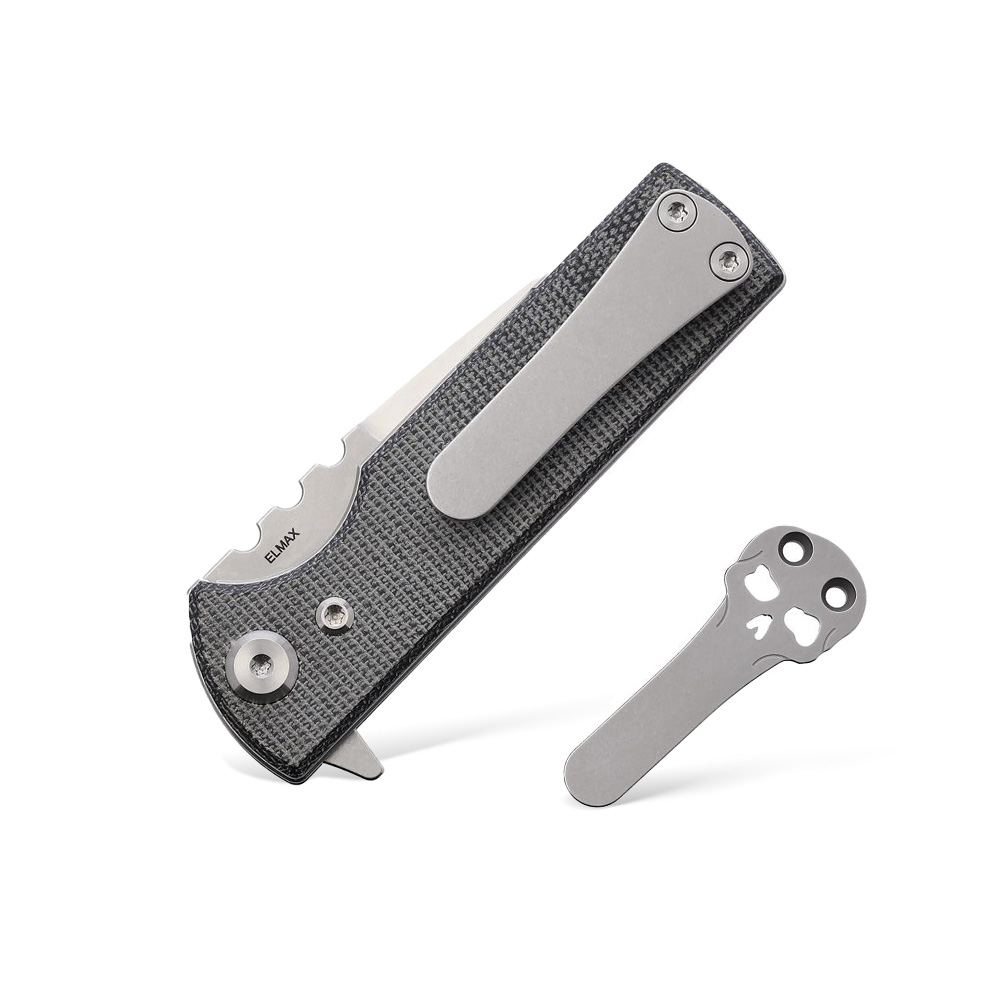 - Handle: Steel frame, G10 backspacer, black Micarta (Black Canvas Micarta) scales, steel Torx screws, steel pocket clip (stonewash finish)