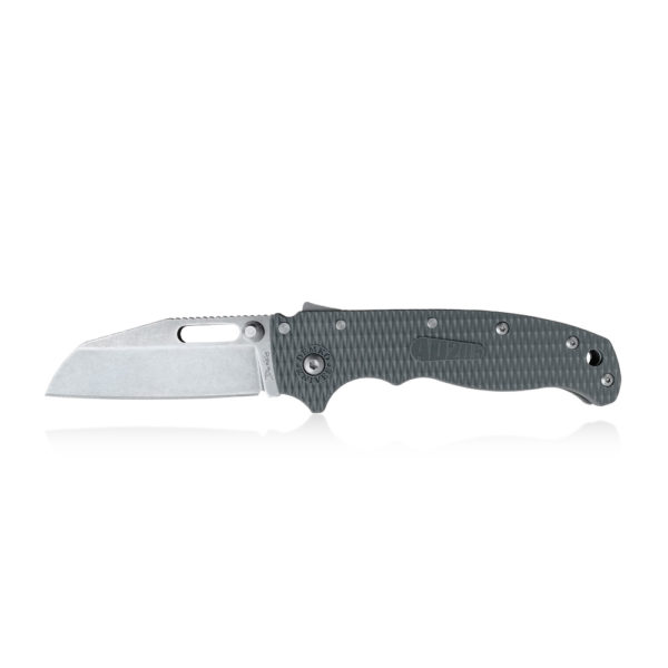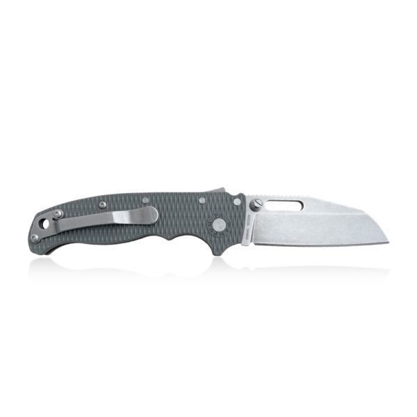 Presented Demko Knives AD20.5 Shark Foot AUS10A Shark Lock Gray Grivory Folding Knife Folder has shark foot (sheepsfoot) blade made of Japanese AUS10A stainless steel, finished in a stonewash style, a gray grivory handle and a Shark Lock ™ mechanism.
