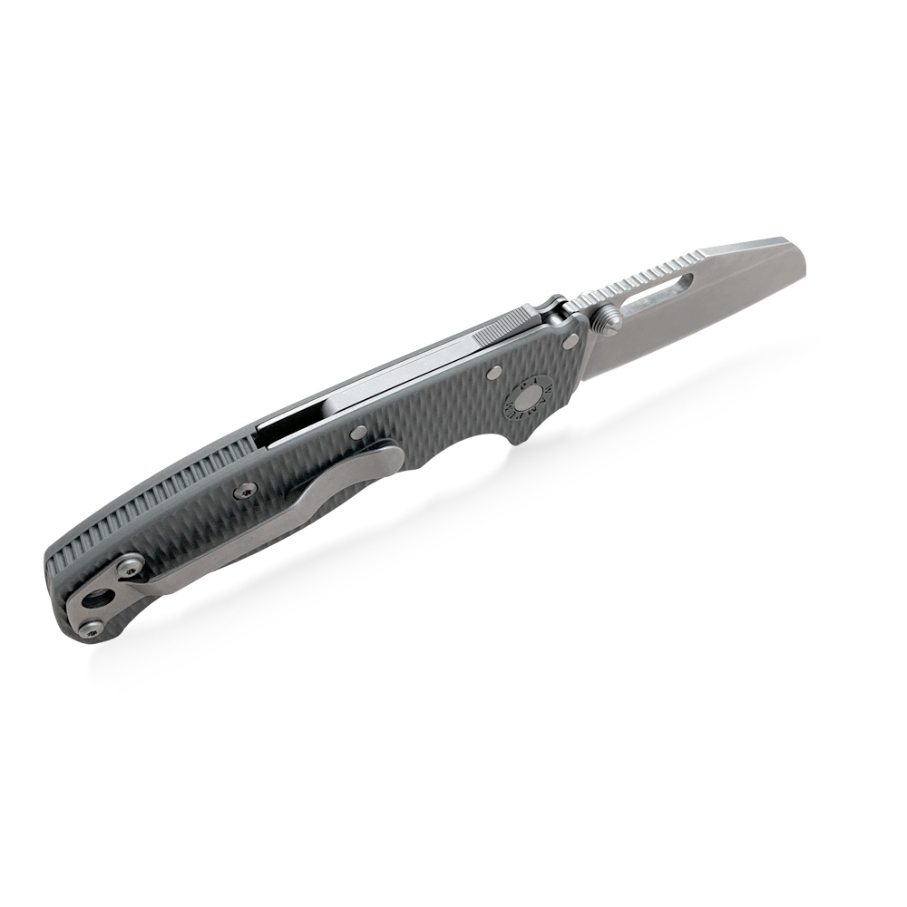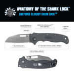 The Shark Lock™ mechanism is situated on the spine of the knife and operated with a ramp-like ‘fin.’ Opening the blade makes the spring-driven lock arm move up and then into a notch in the tang, situating it beneath a lock pin. This range of movement is noteworthy. It’s unique in that the locking mechanism moves forward and back while also moving up and down. This allows for a greater sized blade tang, making better mechanical advantage in a specific area. And because the drive spring that moves the locking element up into the locked position is contained within the locking arm itself, it won’t be subject to dirt and grime. The Shark is very comparable to most Tri-Ad locks for its size and weight. The AD-20.5 has been tested to 875 inch pounds of torque (10 kg/m), this is a very impressive number for a 3.5 oz. (100 g) knife.