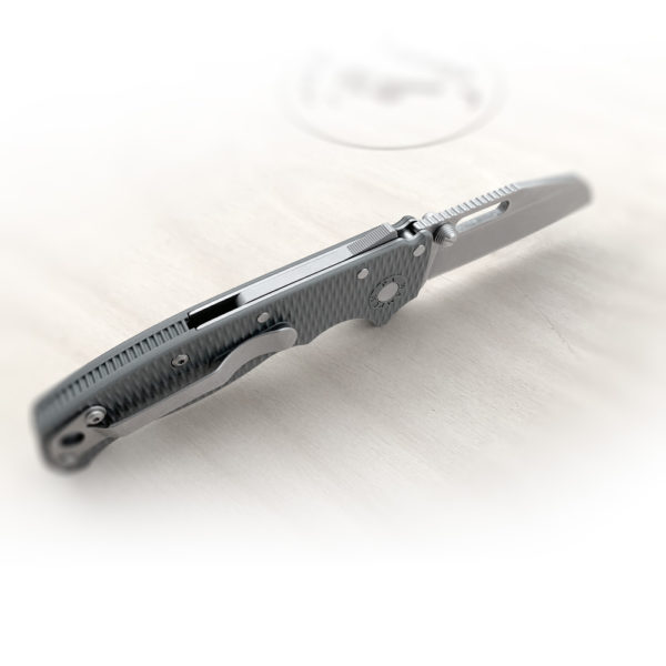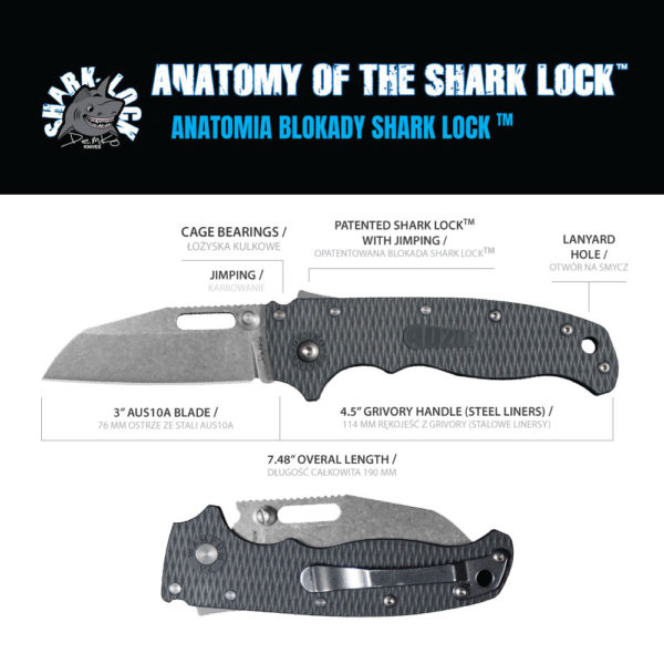 The Shark Lock™ mechanism designed and engineered by Andrew Demko mechanizm Shark Lock™ is designed to easily open and close the knife with one hand. In combination with ball bearings, grivory grips mounted on steel liners, we get a free-working knife that will handle most tasks!