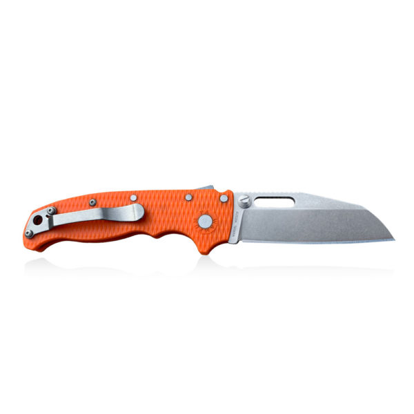Presented Demko Knives AD20.5 Shark Foot AUS10A Shark Lock Orange Grivory Folding Knife Folder has shark foot (sheepsfoot) blade made of Japanese AUS10A stainless steel with stonewash finish and an orange grivory handle and a Shark Lock ™ mechanism.