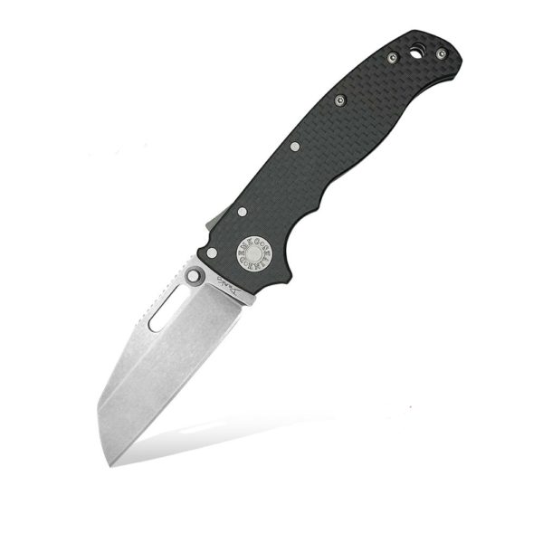 Presented Demko Knives AD20.5 Shark Foot S35VN Shark Lock Carbon Fiber Folding Knife has shark foot (sheepsfoot) blade made of CPM S35VN stainless steel with stonewash, Carbon Fiber handle and a Shark Lock ™ mechanism.