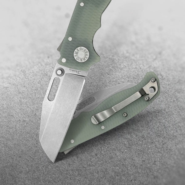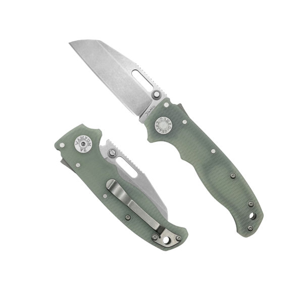 - Blade: folding knife, Shark Foot profile, flat grind, plain cutting edge