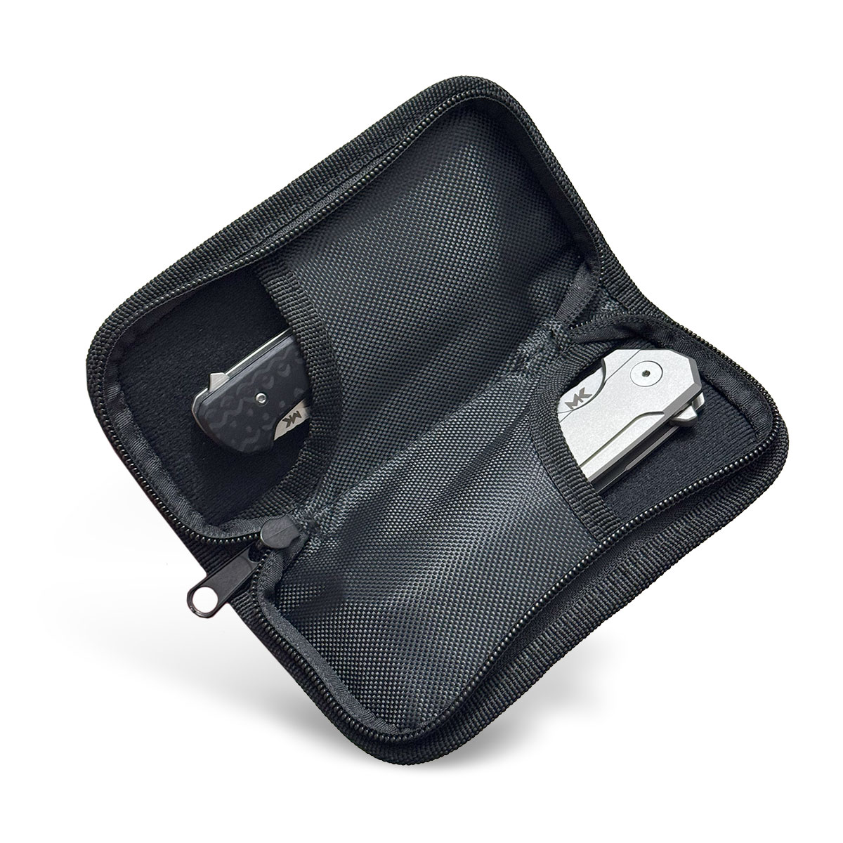 Holds two folding knives up to approximately 145 mm (5.7″) closed length. Thanks to its well-thought-out interior, it also works perfectly as a small EDC organizer for a multitool, flashlight, batteries, or other everyday essentials you want to keep close at hand.