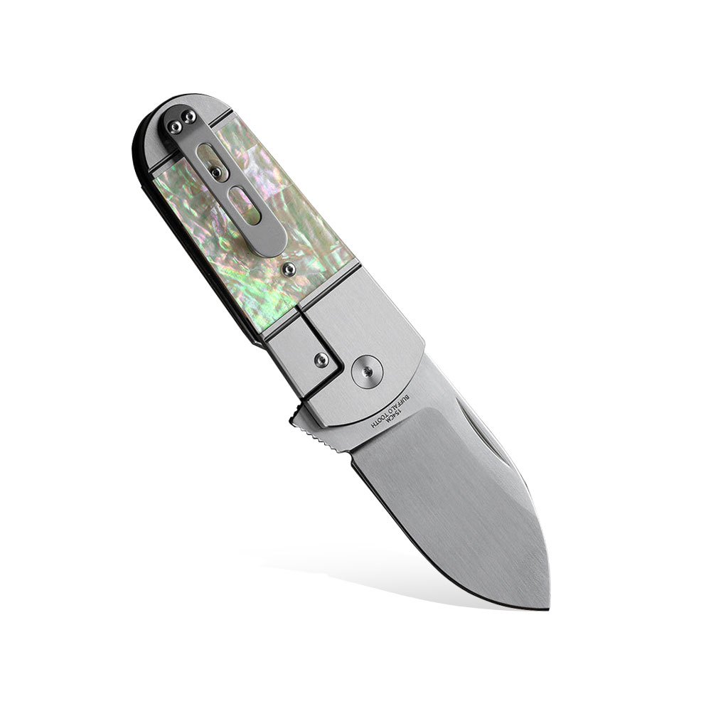 - Handle: titanium, mother-of-pearl overlays, titanium clip (Tip-Up)