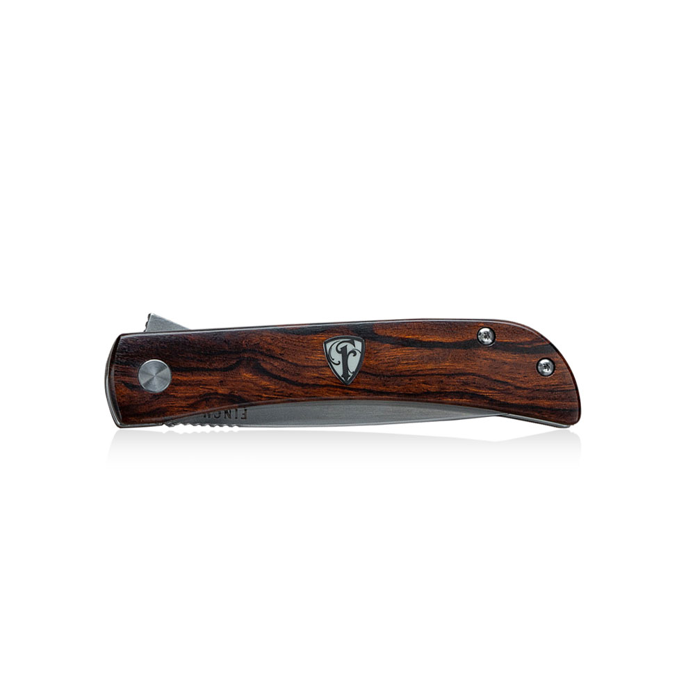Finch Chernobyl Ant Ironwood Folding Knife it has a usable, satin drop point blade with a flat grind, made of 14C28N steel, and ironwood scales on steel liners. The knife has a liner lock, while the flipper is used to open it. The blade works on ceramic bearings. For convenient carrying of the knife ther is a titanium clip (Tip-Up).