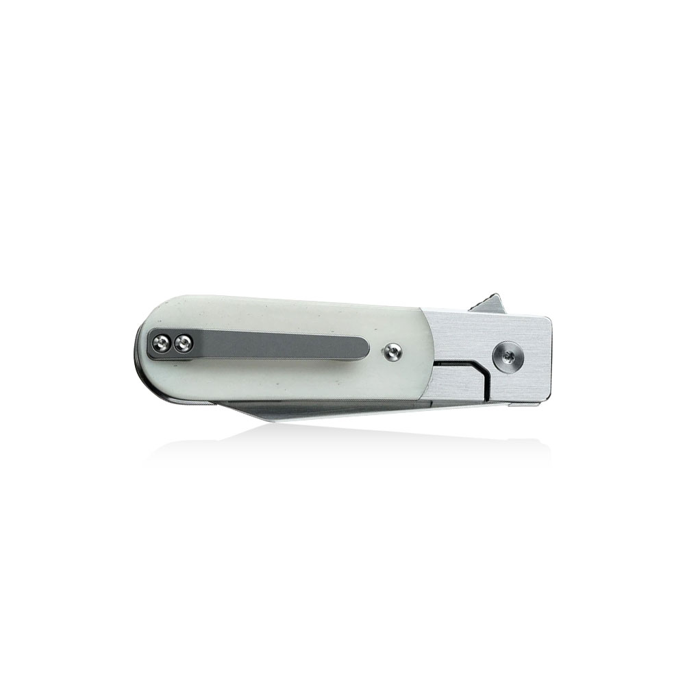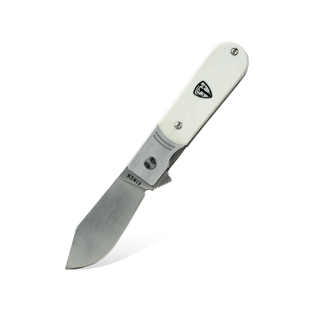 Finch Model 1929 Voodoo Folding Knife has a clip point blade made from American 154CM steel. Knife has steel bolster and body and handle scales from white bone. The handle has a fluorescent insert with the Finch logo. The knife is opened due to the protruding fin (flipper) and the blade is blocked by a frame lock. The knife is equipped with a titanium carrying clip.
