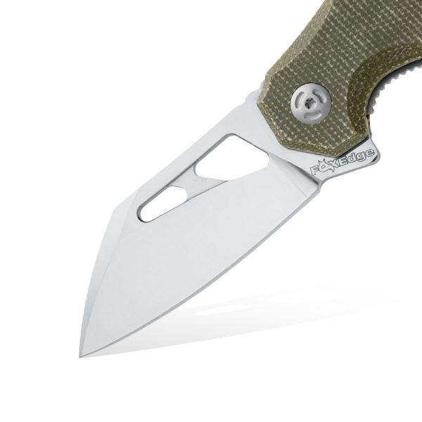 FOX Edge Atrax FE-027 MOD by Denis Simonutti Folding Knife has a 9Cr13MoV stainless steel blade (in satin) and a handle made of steel and green canvas micarta. We open the knife blade with one hand using a flipper or holes in the blade. The open blade is protected by a liner lock. The knife is equipped with a steel pocket clip.