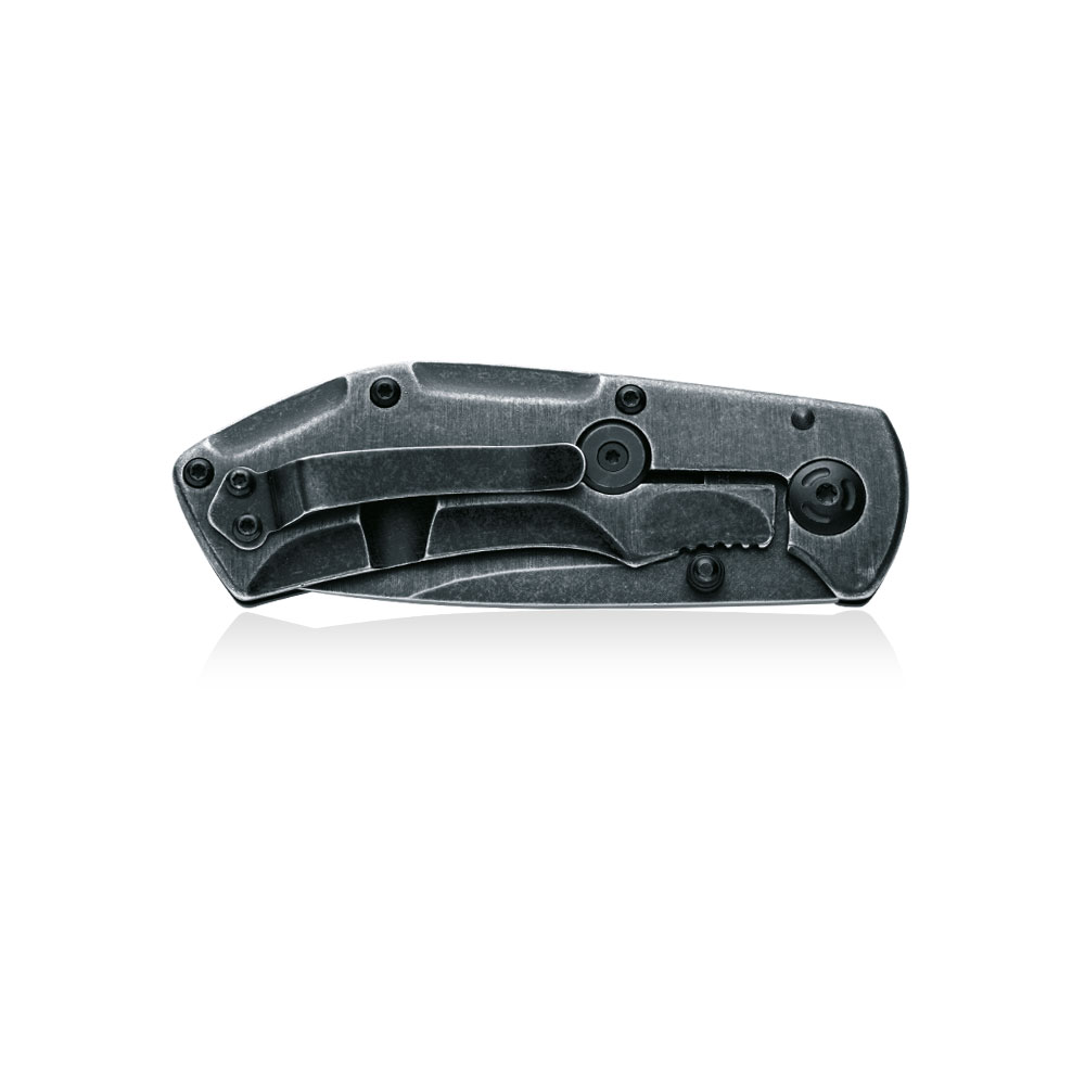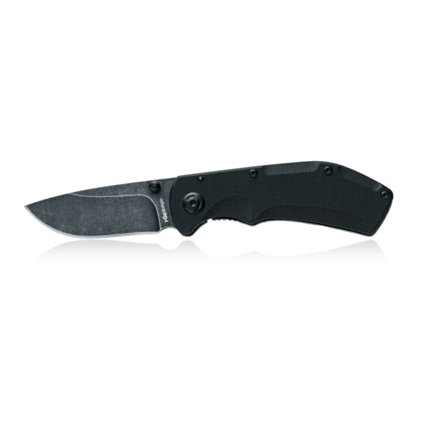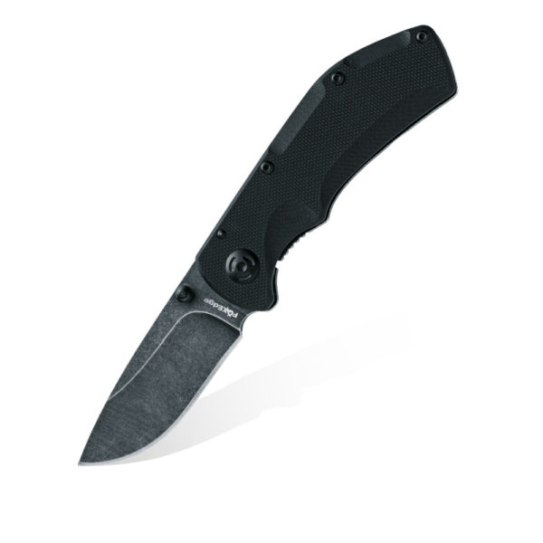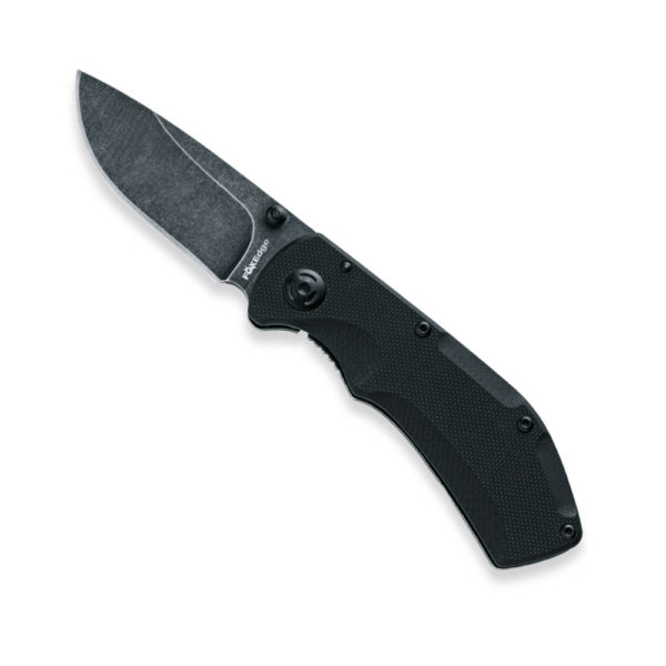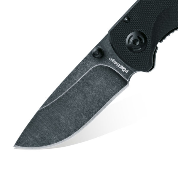 FOX Edge Pop Smoke FE-023 Black G10 Folding Knife by Russ Kommer has an 8Cr13MoV stainless steel blade (in a stone washed PVD coating) and a steel and black G10 composite handle. Knife is opened by thumb-stud (double-sided). The open blade is secured against closing by a frame lock. The knife is equipped with a steel carrying clip.