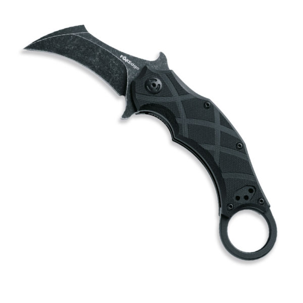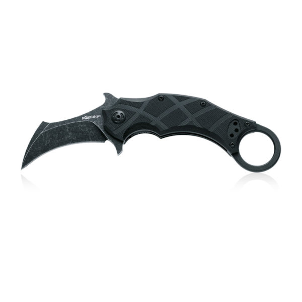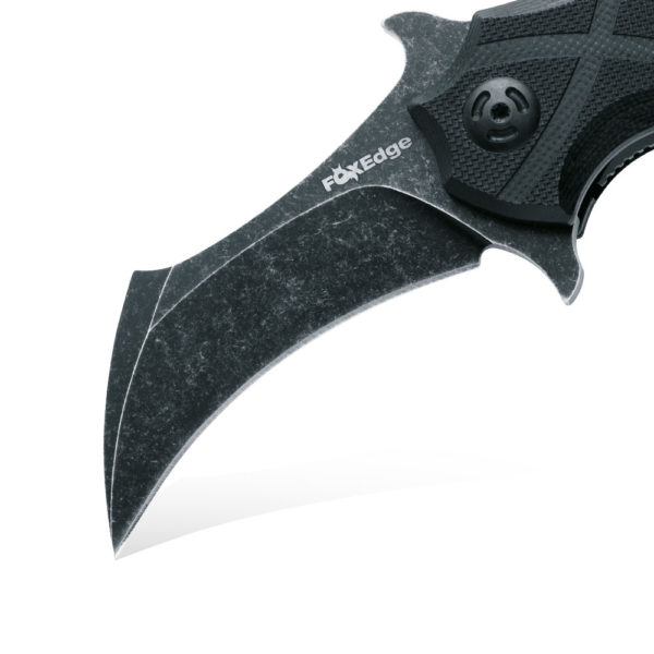 FOX Edge The Claw 2 FE-016 Karambit Folding Knife by Denis Simonutti has an 8Cr13MoV stainless steel blade (in the black Indroglider stone washed coating) and a black G10 composite handle. Opening of the knife blade with one hand is possible thanks to flipper protruding from the blade. The open blade is secured with a liner lock before closing. The knife is equipped with a steel carrying clip.