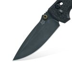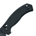 The blade of the knife is equipped with a drop-point profile with a flat grind. The blade’s design makes it extremely versatile, and the narrowing from the spine towards the blade tip improves its piercing properties. Upper jimping, or notches on the spine of the blade where it meets the handle, provides a place for finger support during cuts requiring pressure or those demanding greater precision and control over the edge.