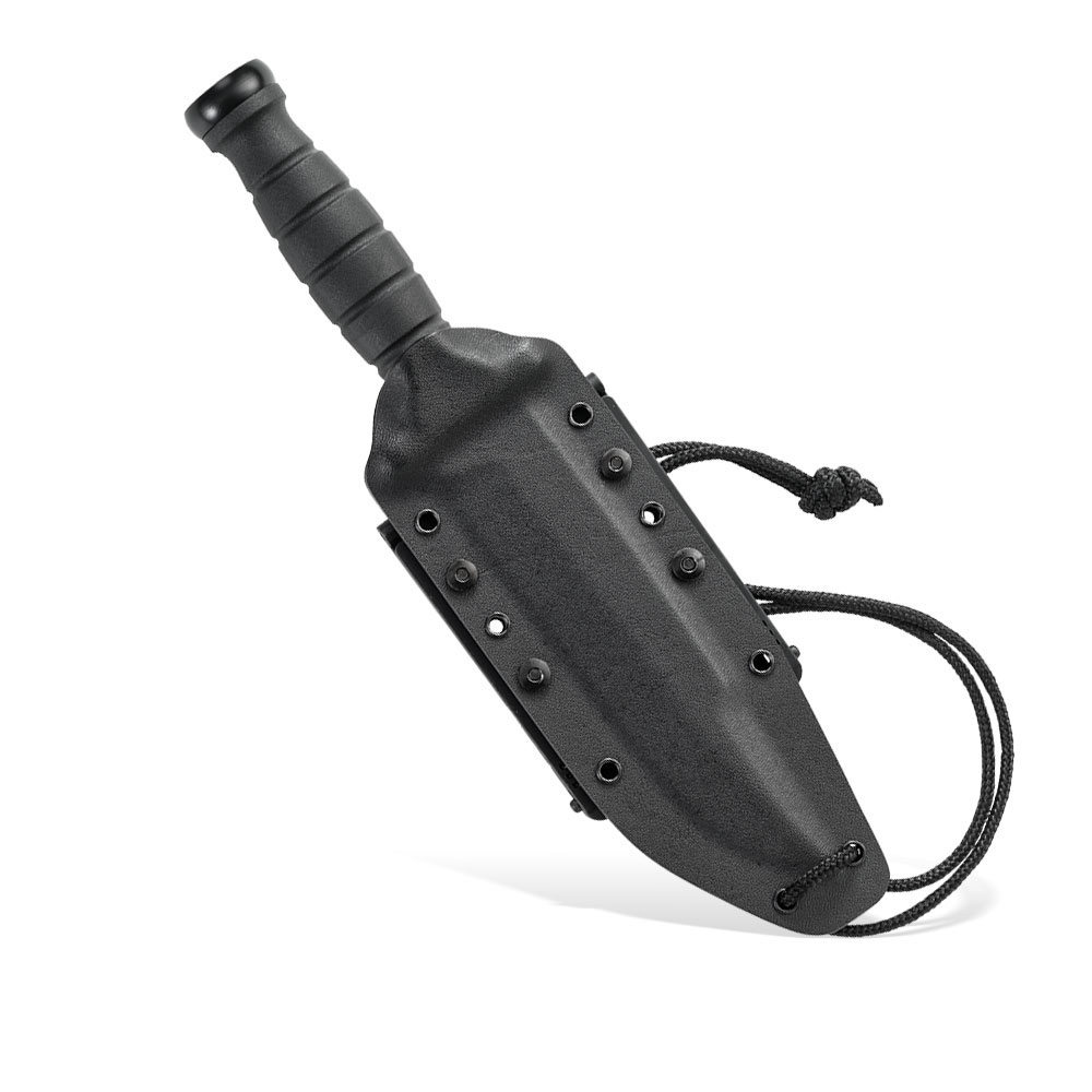W zestawie z nożem otrzymujemy kaburę kydex’ową. Kydex cechuje się wysoką odpornością na uderzenia, zarysowania, charakteryzuje się niską chłonnością wilgoci, odpornością na różnorodne warunki atmosferyczne oraz wiele środków chemicznych. Kabury z niego wykonane użytkujemy wygodnie i długotrwale. Kabura zaopatrzona została w piny przelotowe, do których można przypiąć np. uchwyt na krzesiwo (nie znajduje się w zestawie) lub użyć ich do jej zamocowania na plecaku. Pochwa wyposażona została w linkę w dolnej części służącą do przywiązywania jej do nogi, dzięki czemu w trakcie marszu nóż nie obija się o udo.