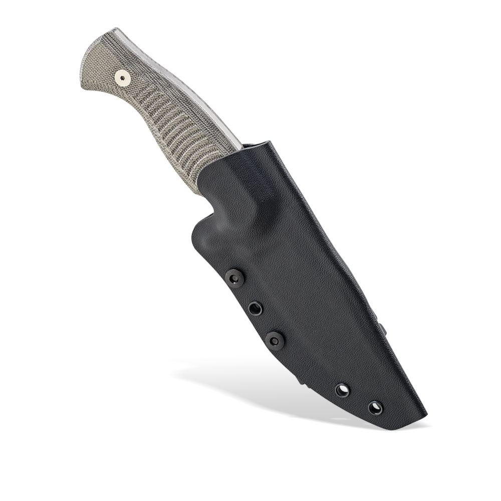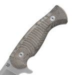 Okładziny rękojeści wykonane zostały z laminatu Micarta odpornego na wilgoć, zmiany temperatury, większość rozpuszczalników i kwasów, posiadającego wysoką odporność na uszkodzenia mechaniczne. Micarta znana ze swoich doskonałych właściwości, również wizualnych (daje się stylizować na naturalny materiał) ma antypoślizgową, chropowatą strukturę. Rękojeść posiada charakterystyczne nacięcia poprawiające pewność uchwytu i umożliwiające zaplecenie na niej dodatkowej linki, czy paracordu, kiedy chcemy aby rękojeść była grubsza i jeszcze bardziej chwytna.